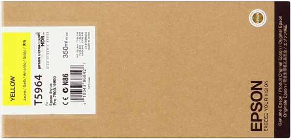 Cartucho de tinta original Epson T5964 (C13T596400) de alta qualidade. Adequado para uso nas seguintes impressoras: Epson Stylus Pro 7700 Epson Stylus Pro 7890 Epson Stylus Pro 7890 Spectro Proofer Epson Stylus Pro 7890 Spectro Proofer UV Epson Stylus Pro 7900 Epson Stylus Pro 7900 Spectro Proofer Epson Stylus Pro 7900 Spectro Proofer UV Epson Stylus Pro 9700 Epson Stylus Pro 9890 Epson Stylus Pro 9890 Spectro Proofer Epson Stylus Pro 9890 Spectro Proofer UV Epson Stylus Pro 9900 Epson Stylus Pro 9900 Spectro Proofer Epson Stylus Pro 9900 Spectro Proofer UV Epson Stylus Pro WT7900 Rendimento: 350 ml