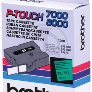 Fita de etiqueta laminada original Brother TX751 Características: -Texto preto sobre fundo verde -Largura 24 mm -Comprimento 15 metros Desempenho: Largura 24mm / 15 metros